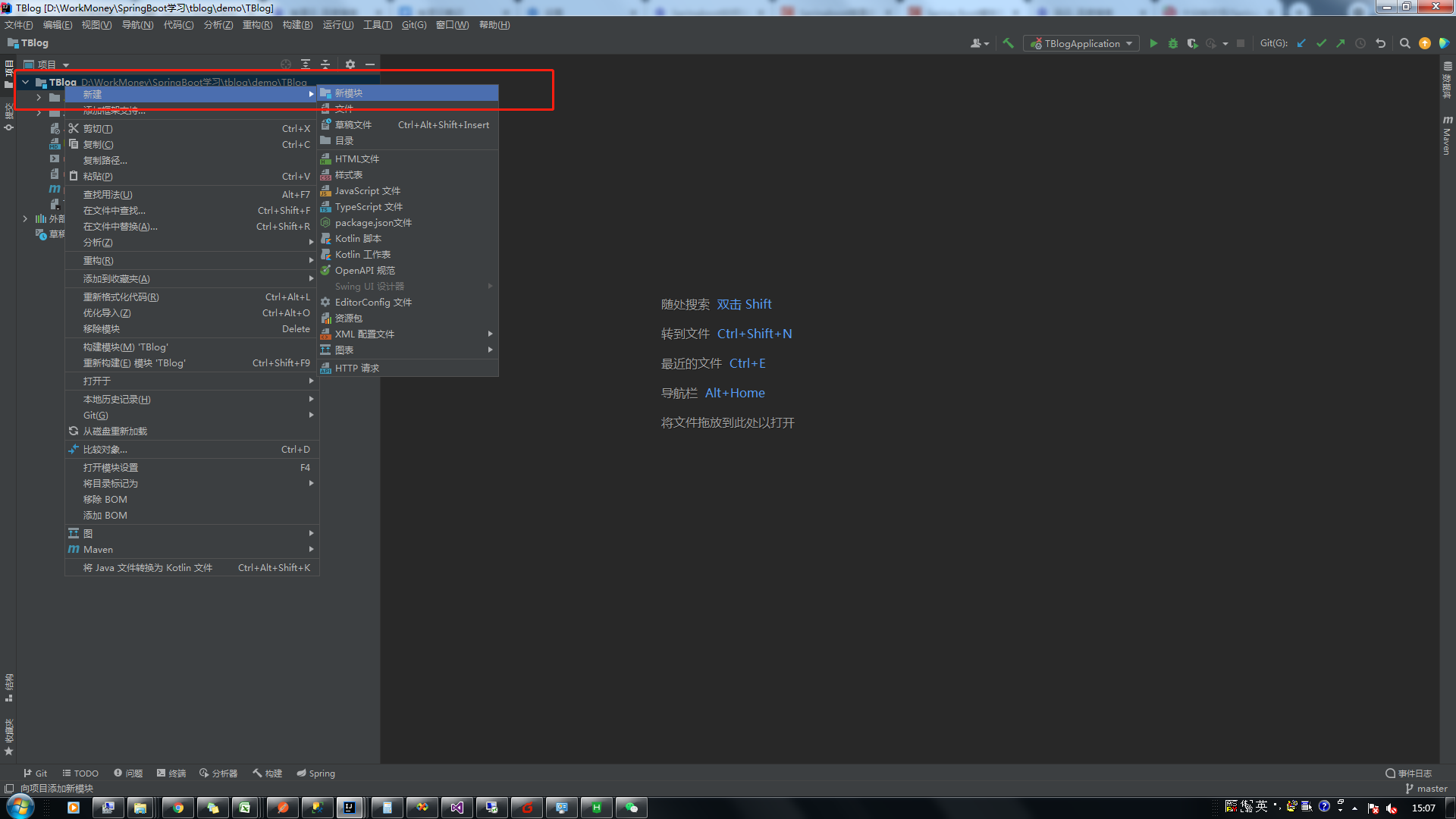 1.右键点击项目选择【新建】——>【新模块】新建自己需要的模块